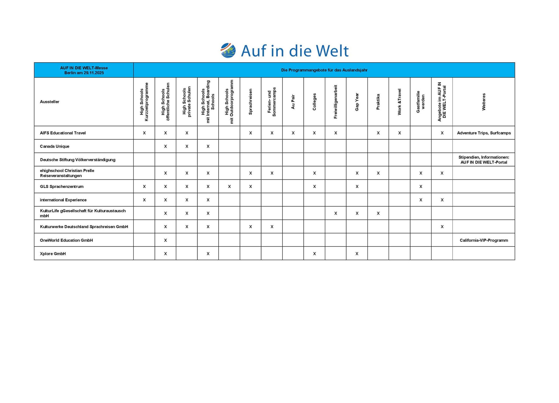 Die Aussteller dieser AUF IN DIE WELT-Messe