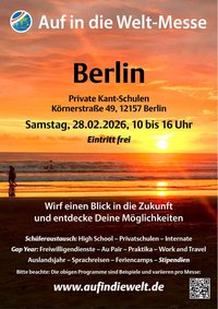 Die Messe ist für Schülerinnen, Schüler, Eltern und Pädagogen in der Privaten Kant-Schule, Körnerstraße 49, 12157 Berlin geöffnet. Der Eintritt ist kostenfrei.