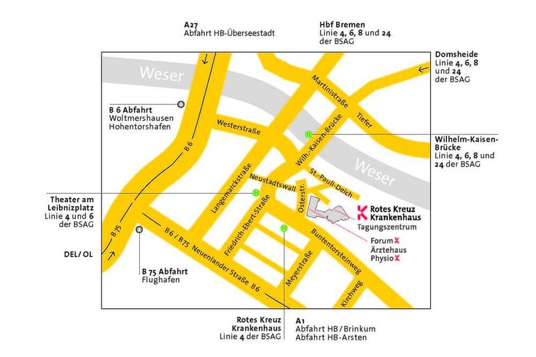 Das Forum K – Tagungszentrum am Rotes Kreuz Krankenhaus liegt verkehrsgünstig in der Nähe vom Kreuz Bremen-Süd. Vom Hauptbahnhof Bremen ist das Tagungszentrum knapp 4 km entfernt.