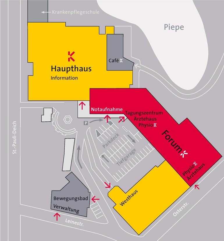 Folgen Sie der Beschilderung zum Haupthaus des Roten Kreuz Krankenhauses (über die Osterstraße oder die Leinestraße erreichbar). Vor dem Haupthaus achten Sie rechts auf die Beschilderung Forum K – Tagungszentrum.