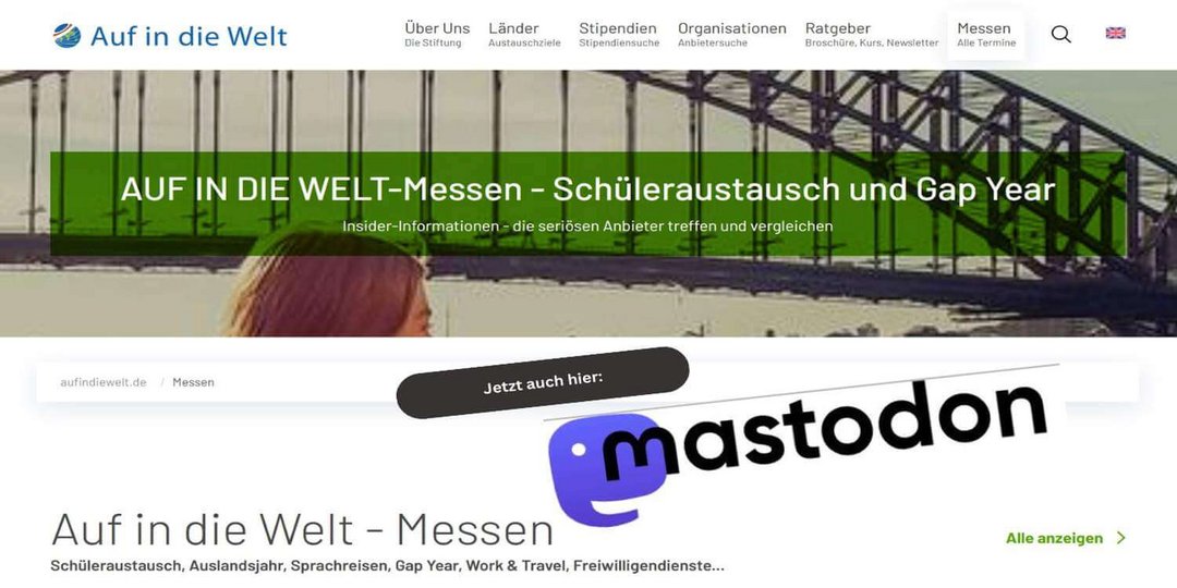 Damit alle Fernwehbegeisterten sich noch leichter über Aktuelles und Termine informieren können, hat AUF IN DIE WELT die Präsenz in den Social Media Kanälen weiter ausgebaut: Ab sofort sind die News und Blog-Beiträge auch auf der Plattform Mastodon zu finden. Der direkte Link zur Präsenz