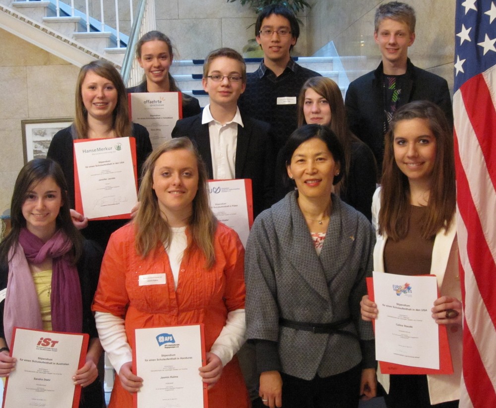 Im Amerikanischen Generalkonsulat an der Alster in Hamburg konnten neun Schülerinnen und Schüler ihre Stipendien-Urkunden entgegen nehmen. Sie hatten sich um die Stipendien beworben, die anlässlich unserer SchülerAustausch-Messen im letzten Jahr für Auslandsaufenthalte im Jahr 2012 ausgeschrieben worden waren.