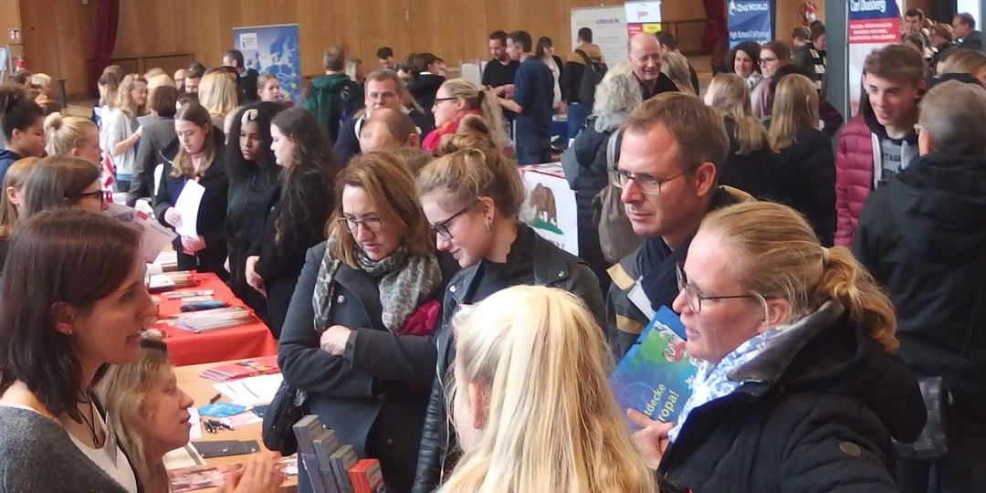 Oberbürgermeister Thomas Geisel eröffnete die Messe. Von Beginn an ließen sich die Besucher den ganzen Tag über an den Ständen und in den Vorträgen über die Angebote und alles Wichtige zu Auslandsaufenthalten informieren. Das Interesse reichte vom Schüleraustausch über Sprachreisen, Freiwilligendienste bis zu Work and Travel, Auslandsstudium und Stipendien. Die Botschaft von Kanada hatte viele Anfragen zu Kanada-Aufenthalten zu beantworten. Die Deutsche Stiftung Völkerverständigung informierte die Familien über die Austausch-Stipendien und weitere Fördermöglichkeiten.