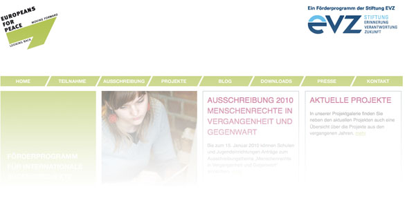Der <link fileadmin user_upload download file>Flyer mit der Ausschreibung gibt einen Überblick. Ausführliche Informationen zum Ausschreibungsthema und vielfältige Projektanregungen sowie eine umfangreiche Linksammlung gibt es unter www.europeans-for-peace.de. Einsendeschluss für Projektskizzen ist der 15. Januar 2010.