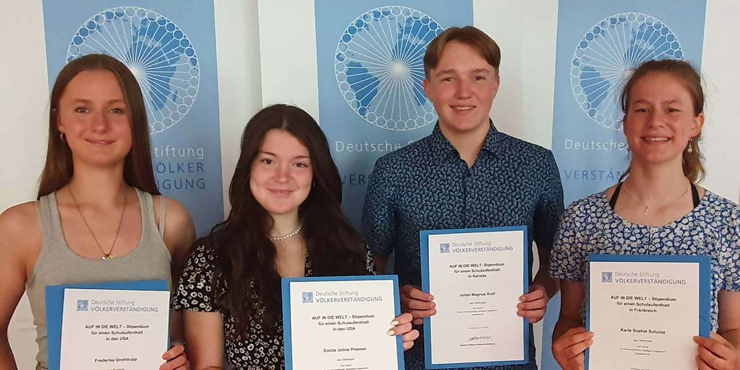 Das Auslandsjahr ist während der Schulzeit, der High School-Aufenthalt als Schüleraustausch im Ausland, ist mit erheblichen Kosten verbunden. Vor diesem Hintergrund vergibt die gemeinnützige Deutsche Stiftung Völkerverständigung jährlich Stipendien an Jugendliche. Die Stipendiaten für das Schuljahr 2023/2024 haben jetzt ihre Urkunden erhalten. Sie werden für ein Schuljahr ins Ausland starten.
