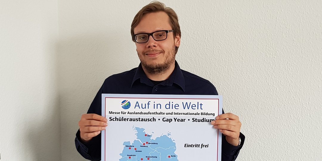 Finn-Marvin Lau ist Projektleiter der Stiftung und organisiert viele AUF IN DIE WELT-Messen. Er sagt „Unsere Messen sind lebendige Marktplätze mit vielen Familien und jugendlichen Besuchern, die sich für Auslandsaufenthalte interessieren. Wir sorgen für den perfekten Ablauf und sind Ansprechpartner der Aussteller und Besucher bei Fragen. Ich freue mich auf eine zupackende, freundliche und kontaktfreudige Verstärkung."