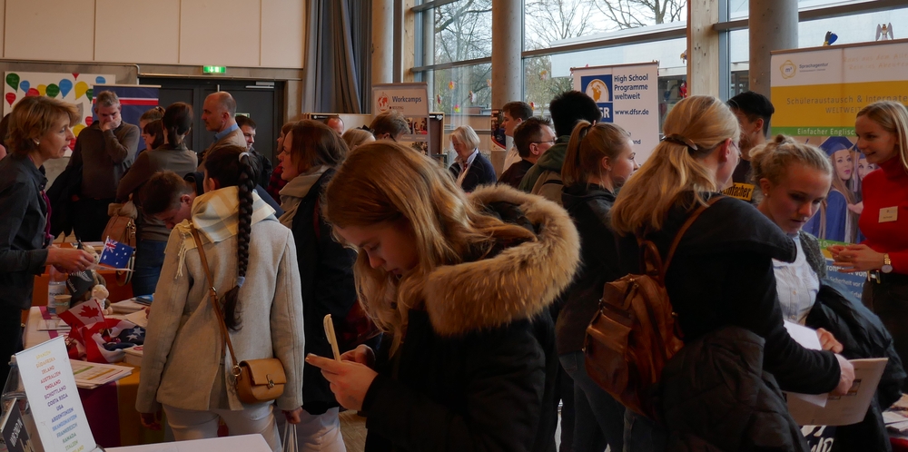 Von Beginn an ließen sich die Besucher den ganzen Tag über an den Ständen und in den Vorträgen über die Angebote und alles Wichtige zu Auslandsaufenthalten informieren. Das Interesse reichte vom Schüleraustausch über Sprachreisen, Freiwilligendienste bis zu Work and Travel, Auslandsstudium und zur Finanzierung von Auslandsaufenthalten. Die Deutsche Stiftung Völkerverständigung informierte die Familien über die Austausch-Stipendien und weitere Fördermöglichkeiten.